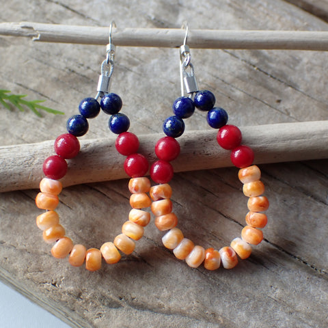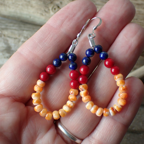 Sterling Silver Spiny Oyster, Red Jasper & Lapis Lazuli Beaded Earrings by Native American Artist
