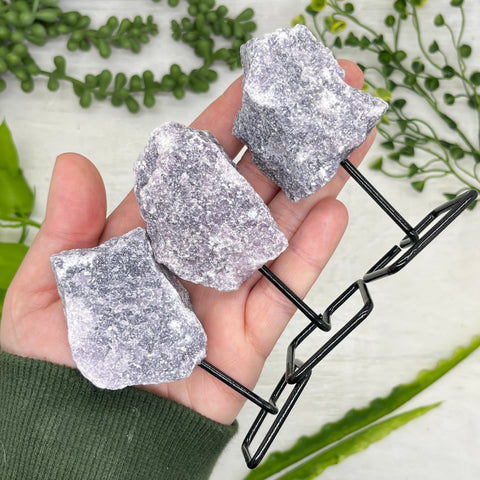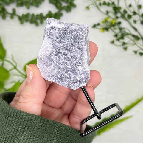 This is a raw lepidolite chunk on a black metal pin stand. You will receive one similar to those in the pictures.