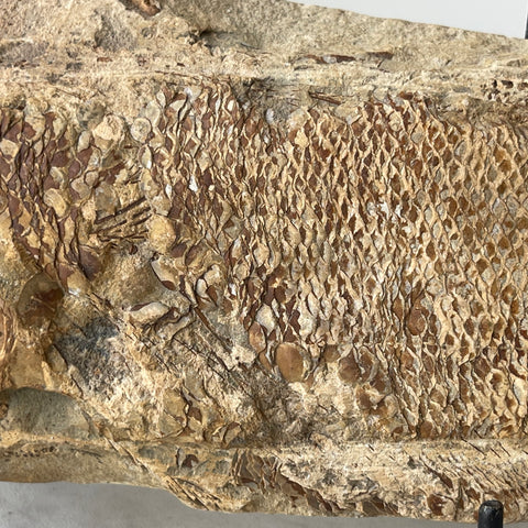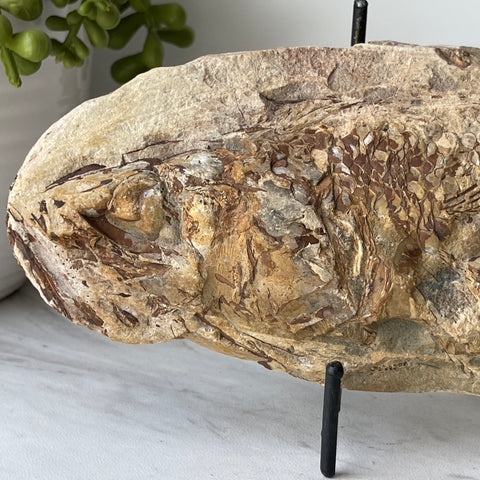 This is a great fish fossil of a fish called Osteoglossidae which was a small freshwater fish that lived in Brazil during the Cretaceous period. This fossil is 9.5 inches wide by 2.5 inches tall. This fossil will come with the stand.