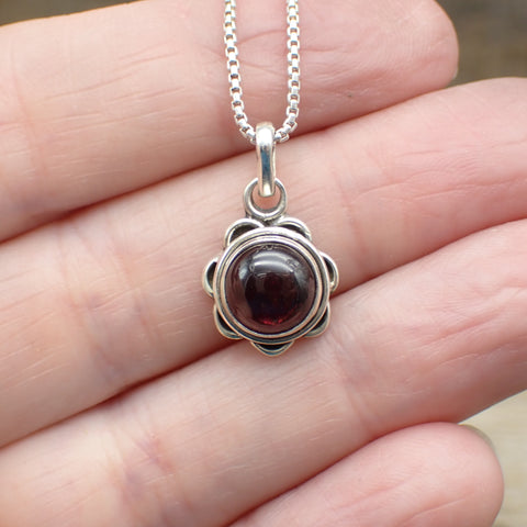 This is a sterling silver pendant featuring a polished garnet. Garnet is believed to promote romantic love, passion, and sensuality, making it a popular choice for those seeking to improve their relationships.