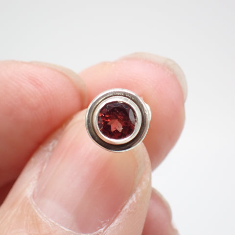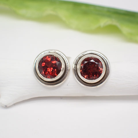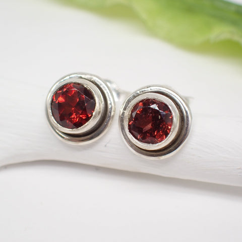 This is a pair of sterling silver studs featuring faceted garnet stones.