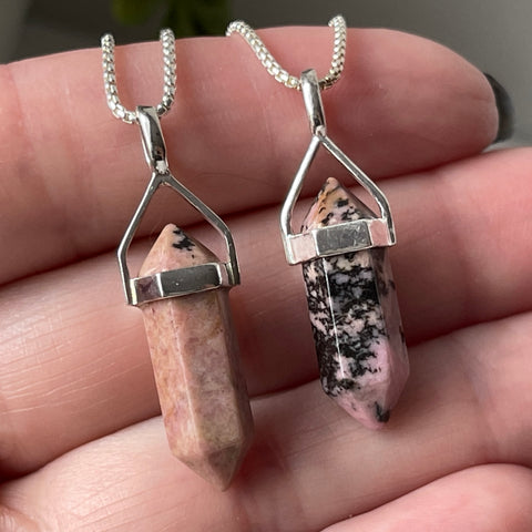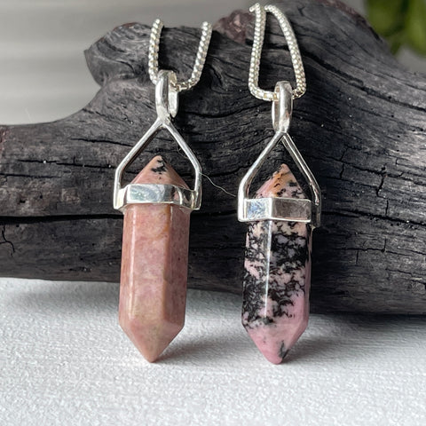This is a sterling silver pendant featuring a rhodochrosite double point. Rhodochrosite is believed to bring compassion, forgiveness and aid with heightened self awareness.