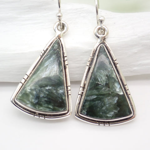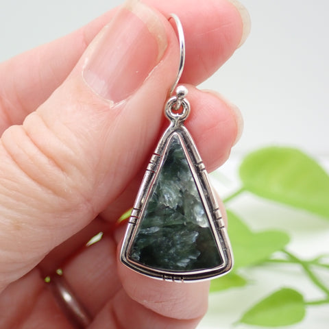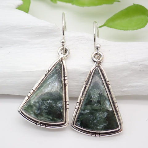 This is a beautiful pair of seraphinite earrings. Seraphinite is an exquisite and enchanting crystal known for its vibrant green hues with silvery-white feathery patterns, resembling angelic wings. This crystal is celebrated for its connection to the angelic realm, spiritual enlightenment, and its association with healing energy.