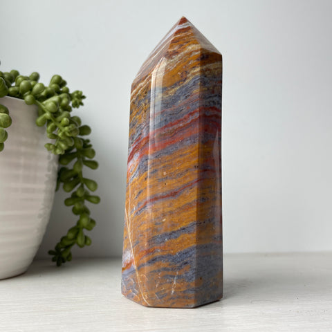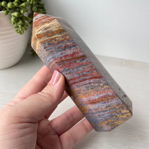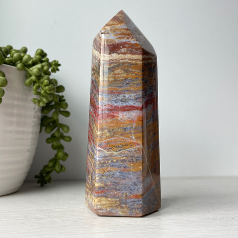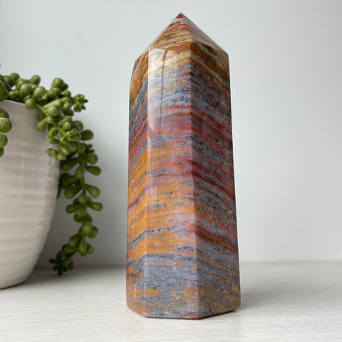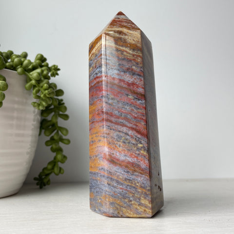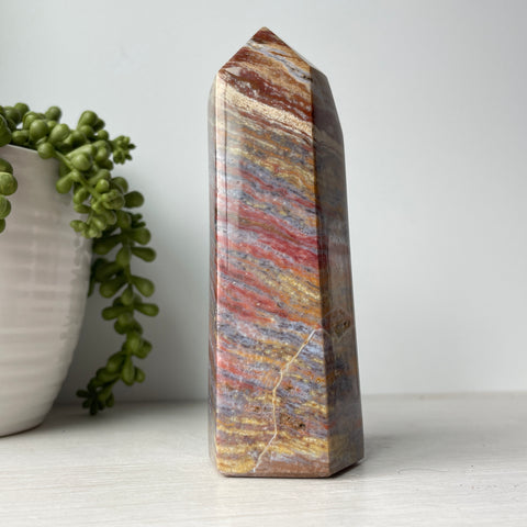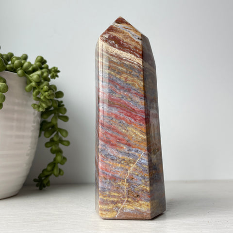 This is a colorful ocean jasper tower. Ocean jasper is a type of orbicular jasper, which is a variety of chalcedony, a cryptocrystalline form of quartz. It is composed primarily of silica with trace impurities that give it its distinctive colors and patterns.
