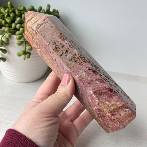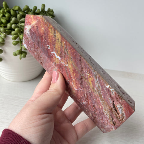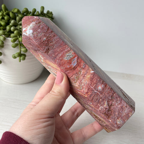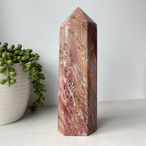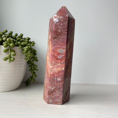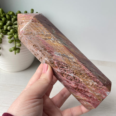 This is a colorful ocean jasper tower. Ocean jasper is a type of orbicular jasper, which is a variety of chalcedony, a cryptocrystalline form of quartz. It is composed primarily of silica with trace impurities that give it its distinctive colors and patterns.