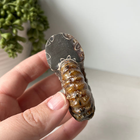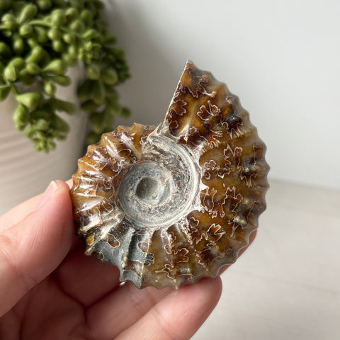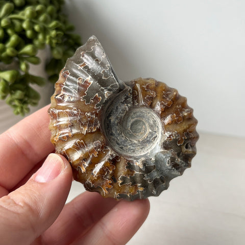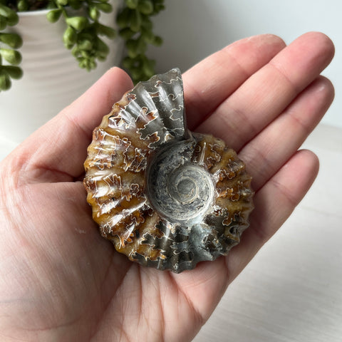 This is a full, polished sutured tractor ammonite. Ammonites were marine mollusks that lived in the world's oceans for millions of years, from the Devonian period around 400 million years ago until the end of the Cretaceous period around 66 million years ago. They were cephalopods, related to modern-day squids and octopuses, and they inhabited a variety of marine environments, from shallow coastal waters to deep ocean basins.