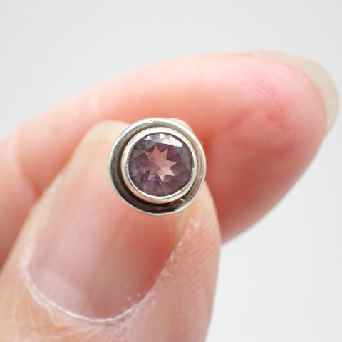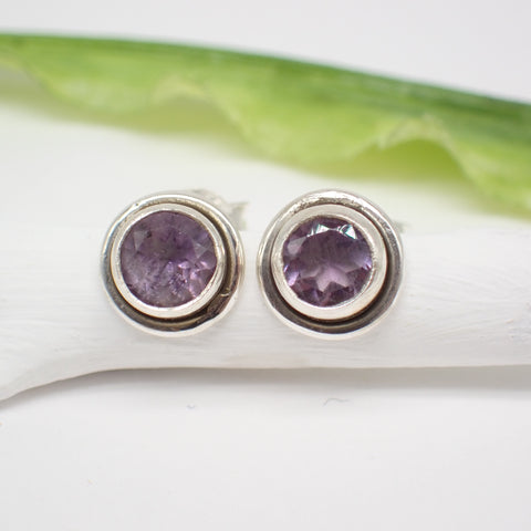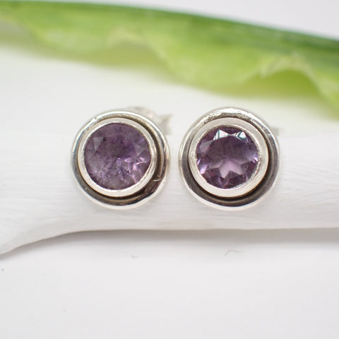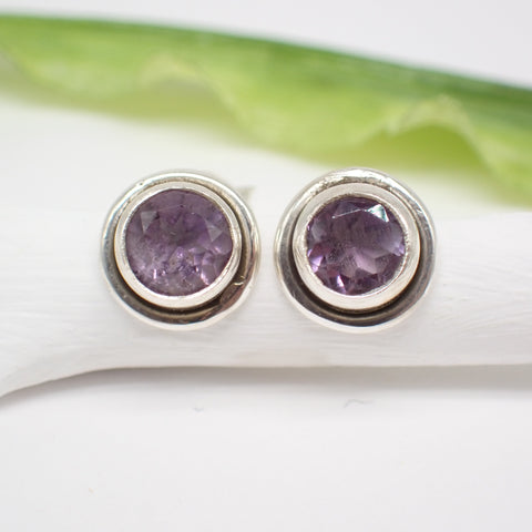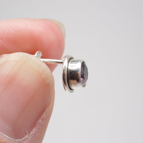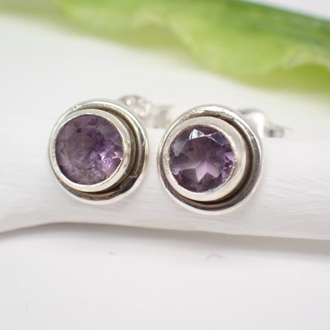 This is a pair of sterling silver studs featuring faceted amethyst stones.