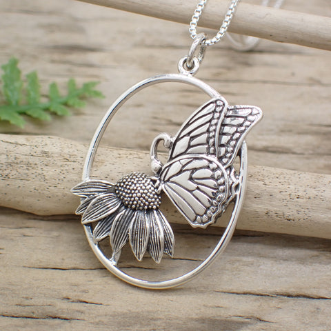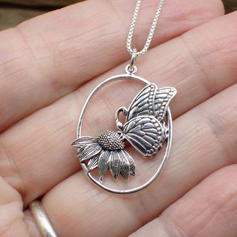 This is a beautiful butterfly on a flower charm made from recycled sterling silver.
