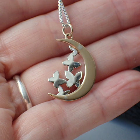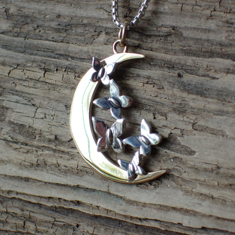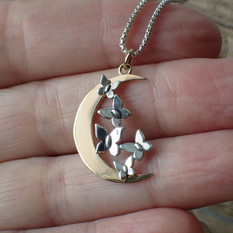 ♻️Recycled Sterling Silver Mixed Metal Moon With Butterflies Necklace