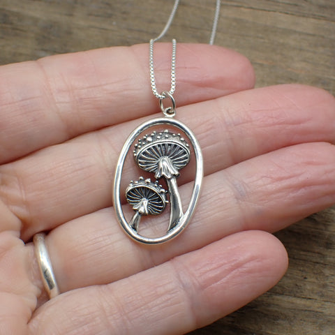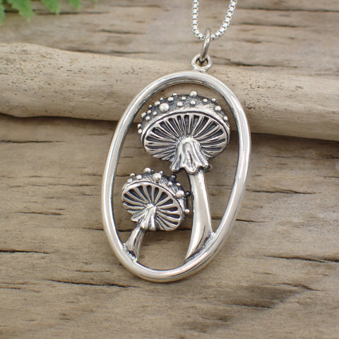 This is a detailed mushroom pendant made from recycled sterling silver.