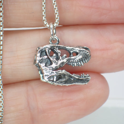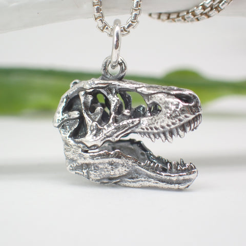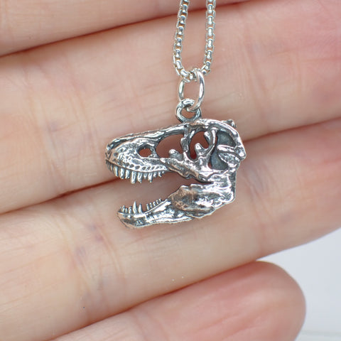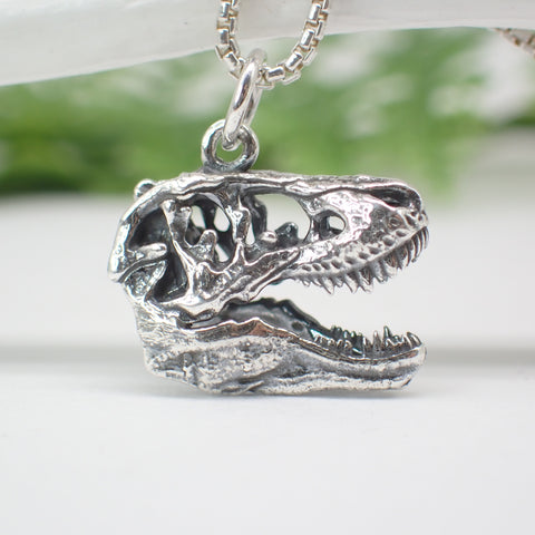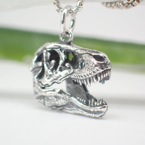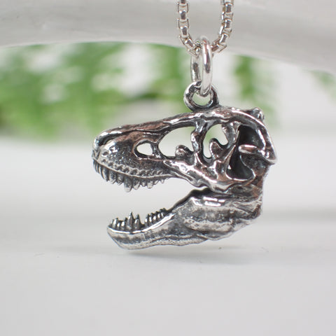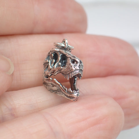 This sterling silver 3D T-Rex skull charm works great as a necklace or on a charm bracelet.