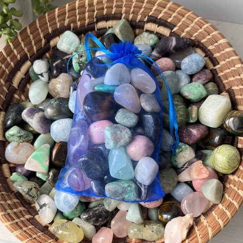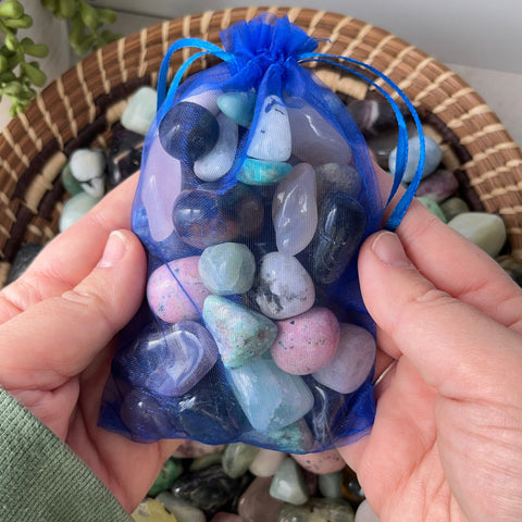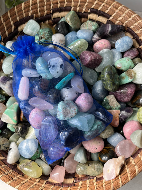 TUMBLES: Amazonite, Anorthosite, Aquamarine, Blue Calcite, Blue Tigers Eye, Chevron Amethyst, Dumortierite, Iolite, Labradorite, Lepidolite, Mangano Calcite, Pink Agate, Pink Moon Quartz, Pink Opal, Pistachio Calcite, Prehnite with Epidote, Rainbow Fluorite, Rainbow Moonstone, Rhodonite, Serpentine, Variscite