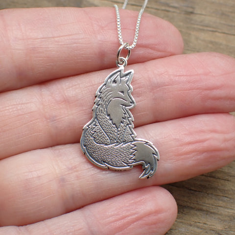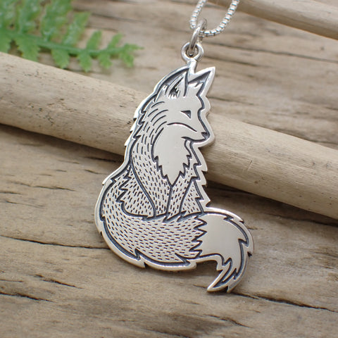Crafted from sterling silver, this pendant measures 33mm in length and 18mm in width, capturing the intricate details of a fox's form.