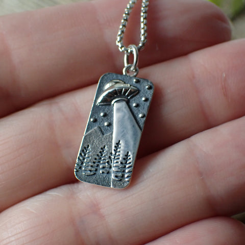This is a sterling silver UFO charm made from recycled sterling silver♻️. The charm measures 26 mm long with the ring and 10 mm wide.