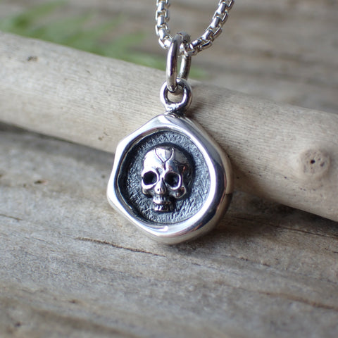 ♻️ Collar con dije de calavera con mini sello de cera de plata de ley reciclada