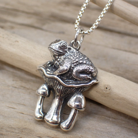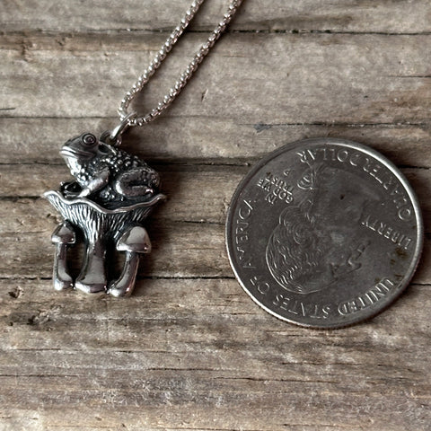 Muy contento y bastante majestuoso, es probable que este colgante de sapo y seta de plata esterlina se convierta en un príncipe ante nuestros ojos. El sapo es un símbolo mixto en el folclore y los cuentos de hadas, a veces un familiar de bruja y otras veces un amuleto de buena suerte. El pobre adulador es muy incomprendido.