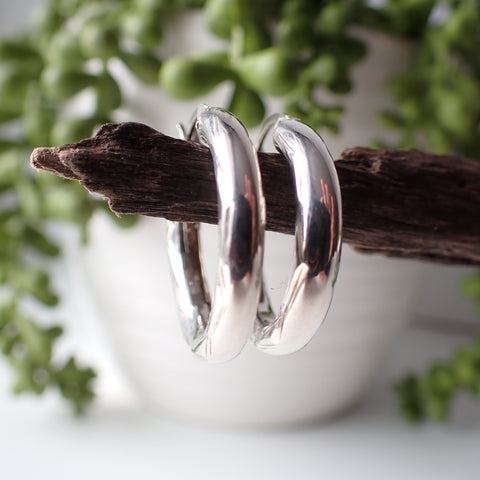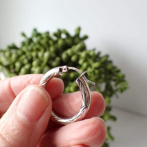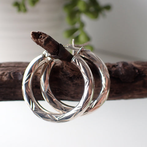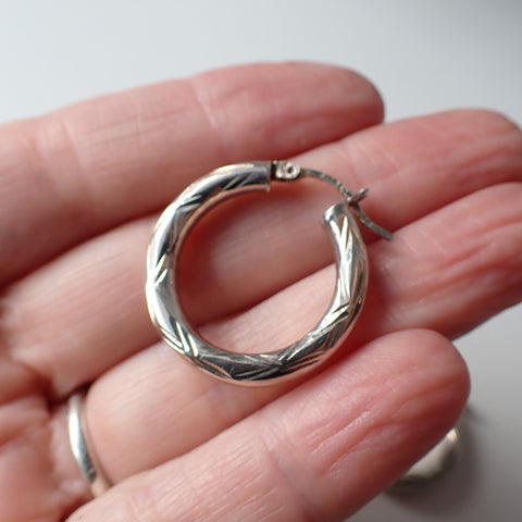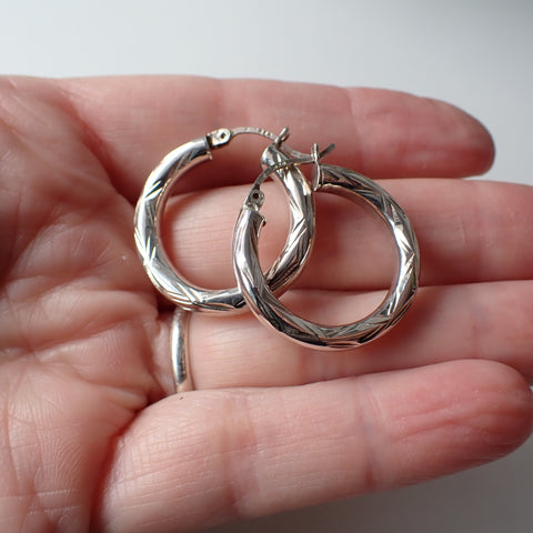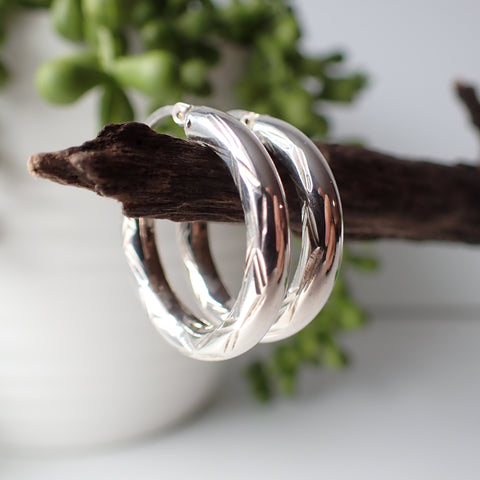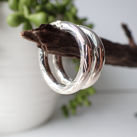 Este es un hermoso par de aretes de aro con patrón hueco grabado en plata de ley. Miden 1" de diámetro y tienen un cierre de clip.