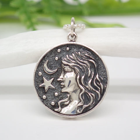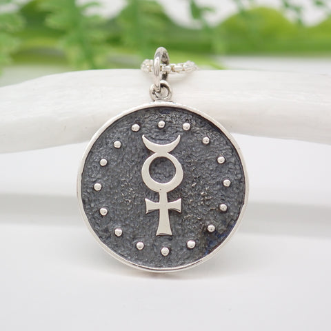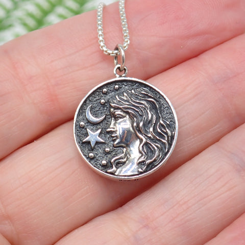 Este collar de plata de ley reciclada♻️ es de doble cara. Un lado muestra a la virgen y el otro muestra el símbolo de Mercurio, que es el regente planetario de Virgo. Mide 5/8" de diámetro. Viene en una cadena de caja redondeada de 1 mm en su elección de 16", 18", 20" o 24" de largo.