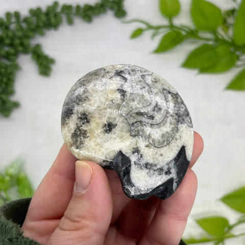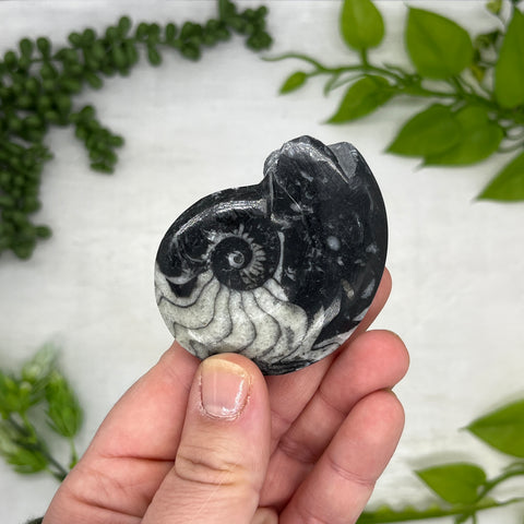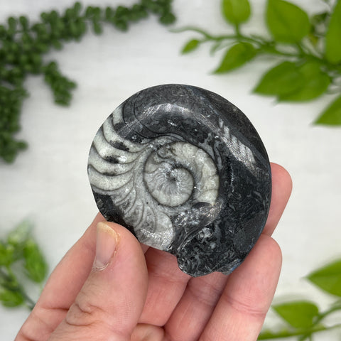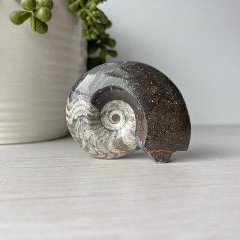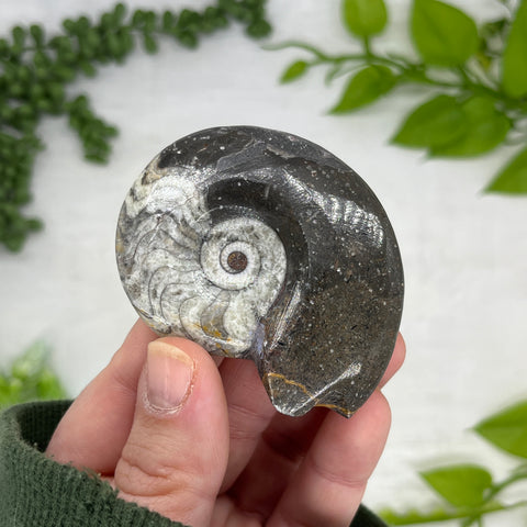 Se trata de una hermosa goniatita pulida, un pariente cercano de la amonita. Al igual que el nautilo, estas criaturas tenían un caparazón dividido en cámaras.