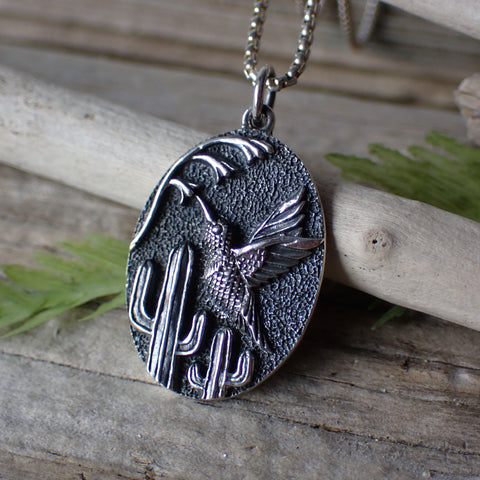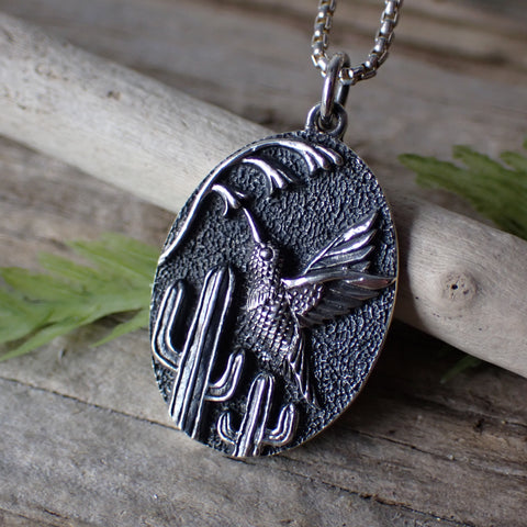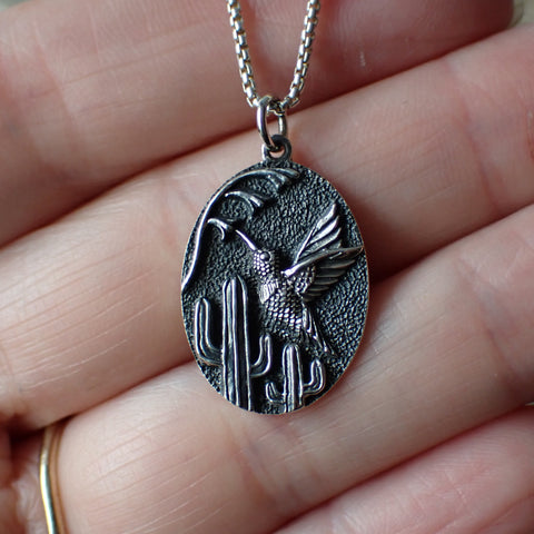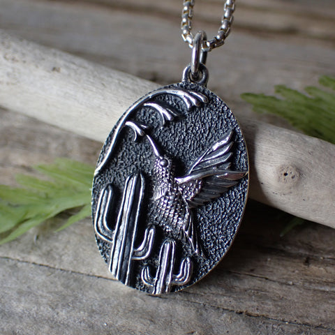 Capturez la beauté délicate d'un colibri en vol, gracieusement posé au milieu d'une tapisserie de fleurs complexes et de cactus résistants. Ce pendentif captivant est méticuleusement fabriqué à la main à partir d'argent sterling recyclé, incarnant notre engagement envers l'élégance et la conscience environnementale.