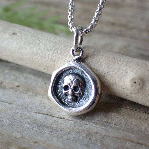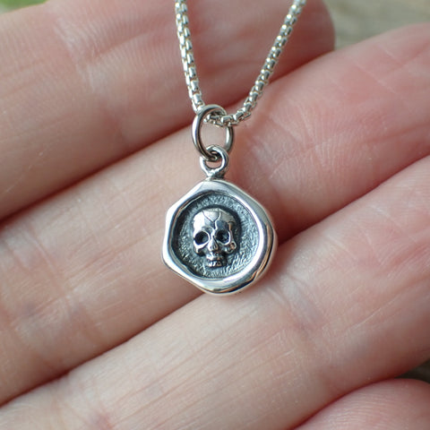 ♻️ Collier de charme de crâne de mini timbre de cire en argent sterling recyclé