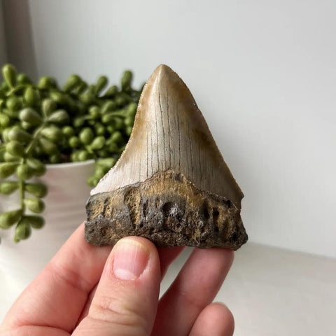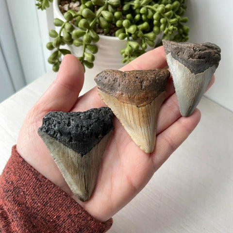 You will receive one genuine megalodon tooth of our choice that measures within the size of your choosing from the corner of the root to the tip of the tooth. The enamel on the front of all of the teeth included is fully intact as seen in the photographs.  This fossil is completely intact and has not been restored or modified but has been lightly polished. This tooth was found by a diver in North Carolina.